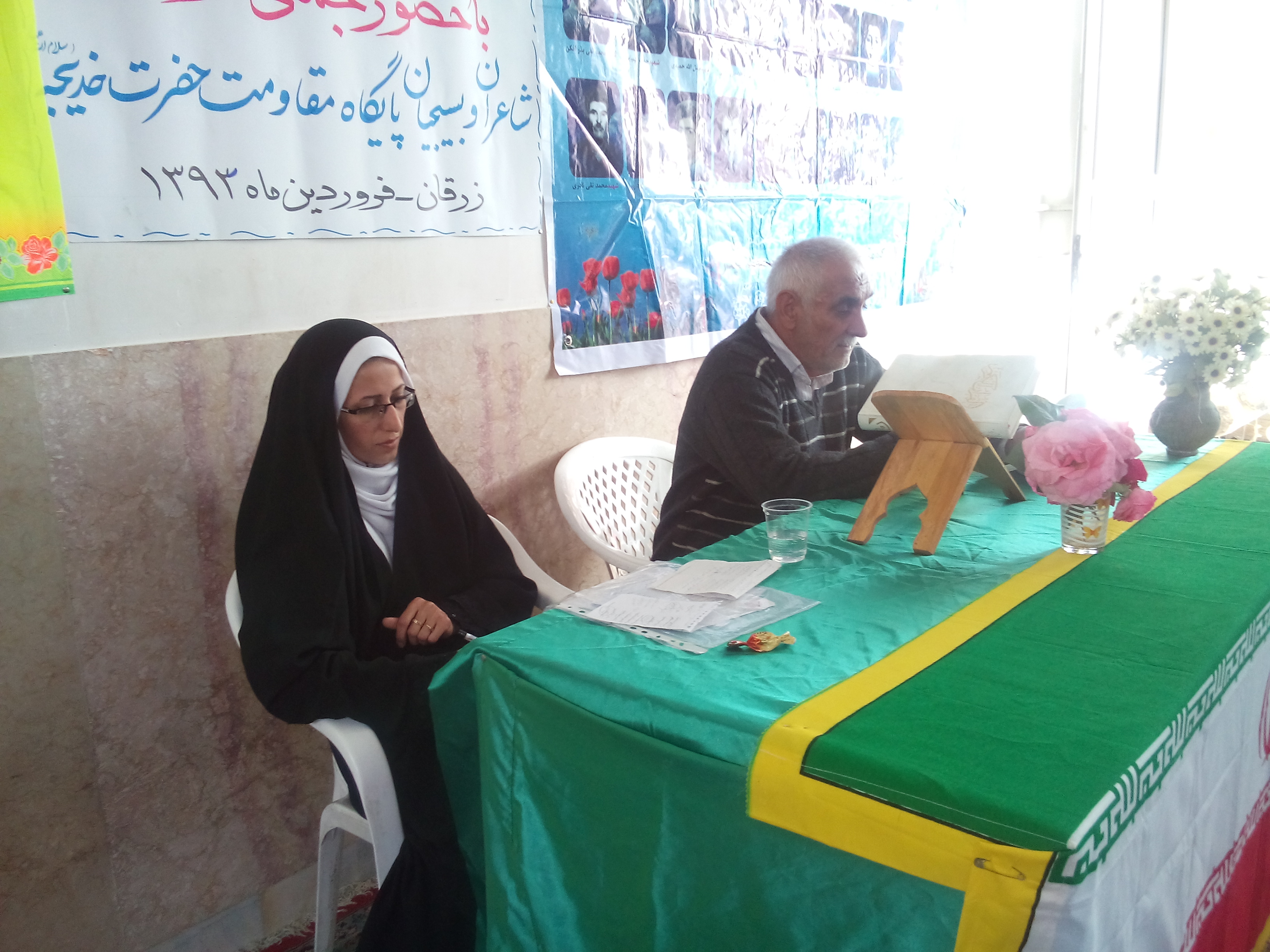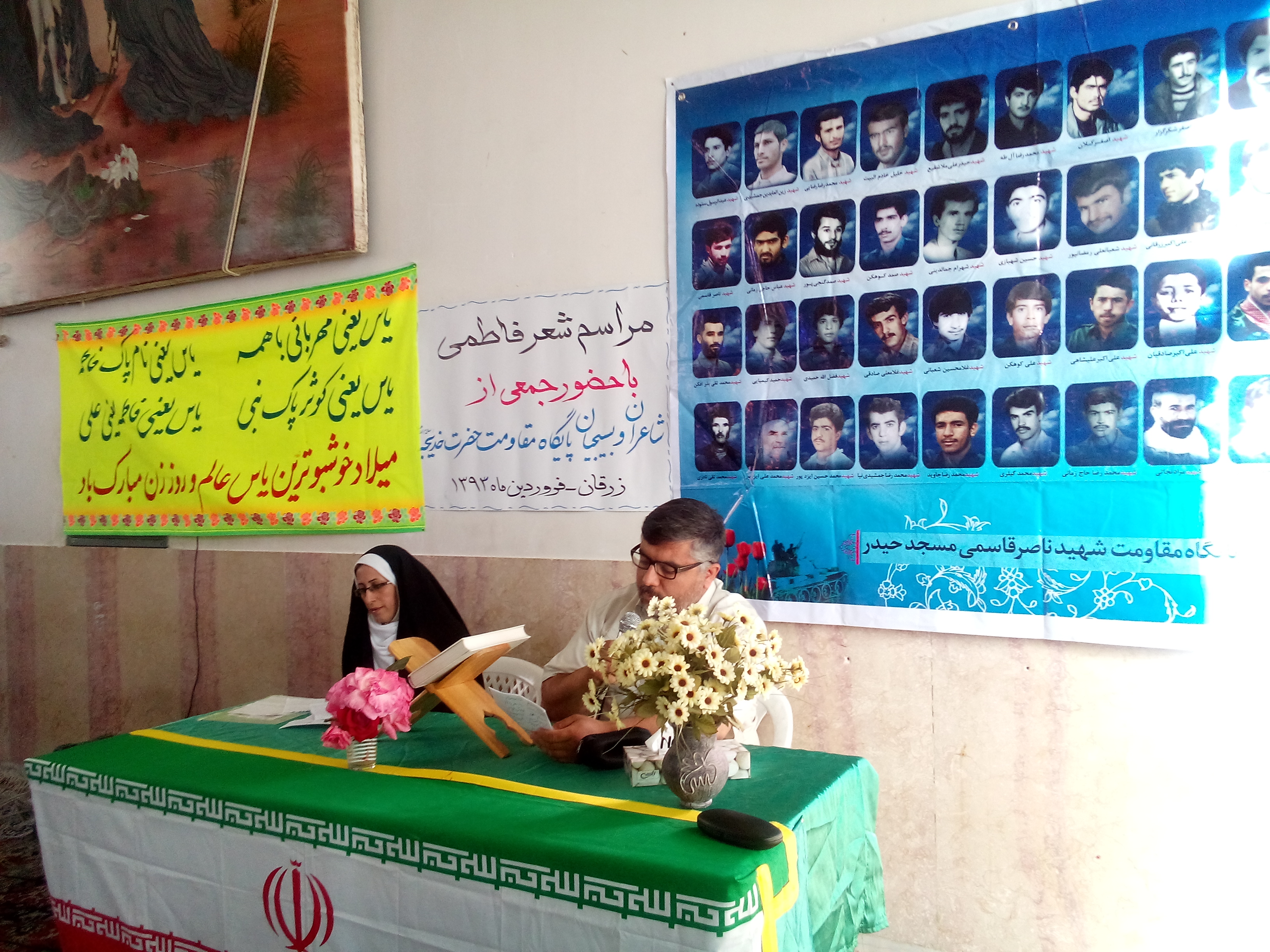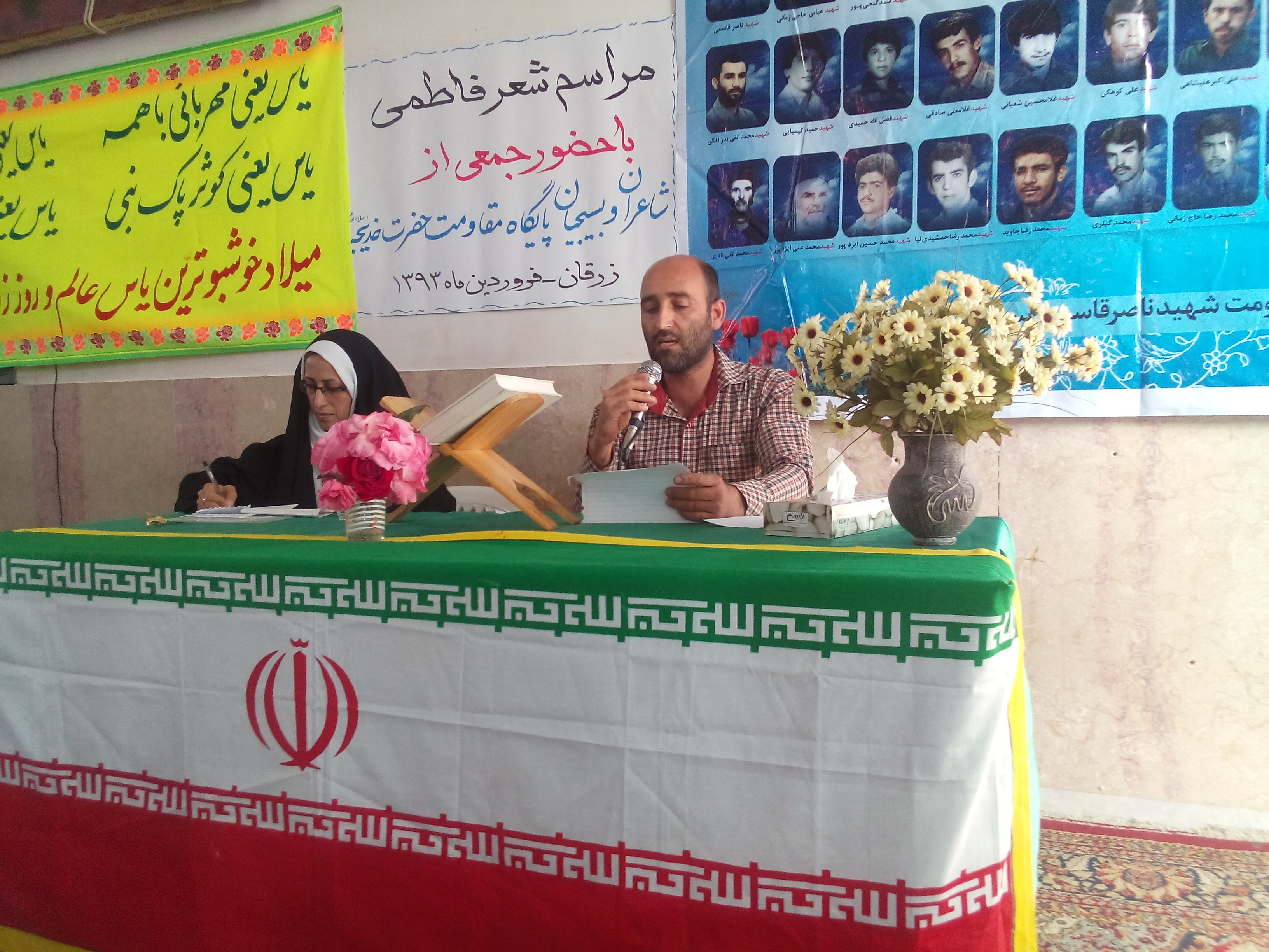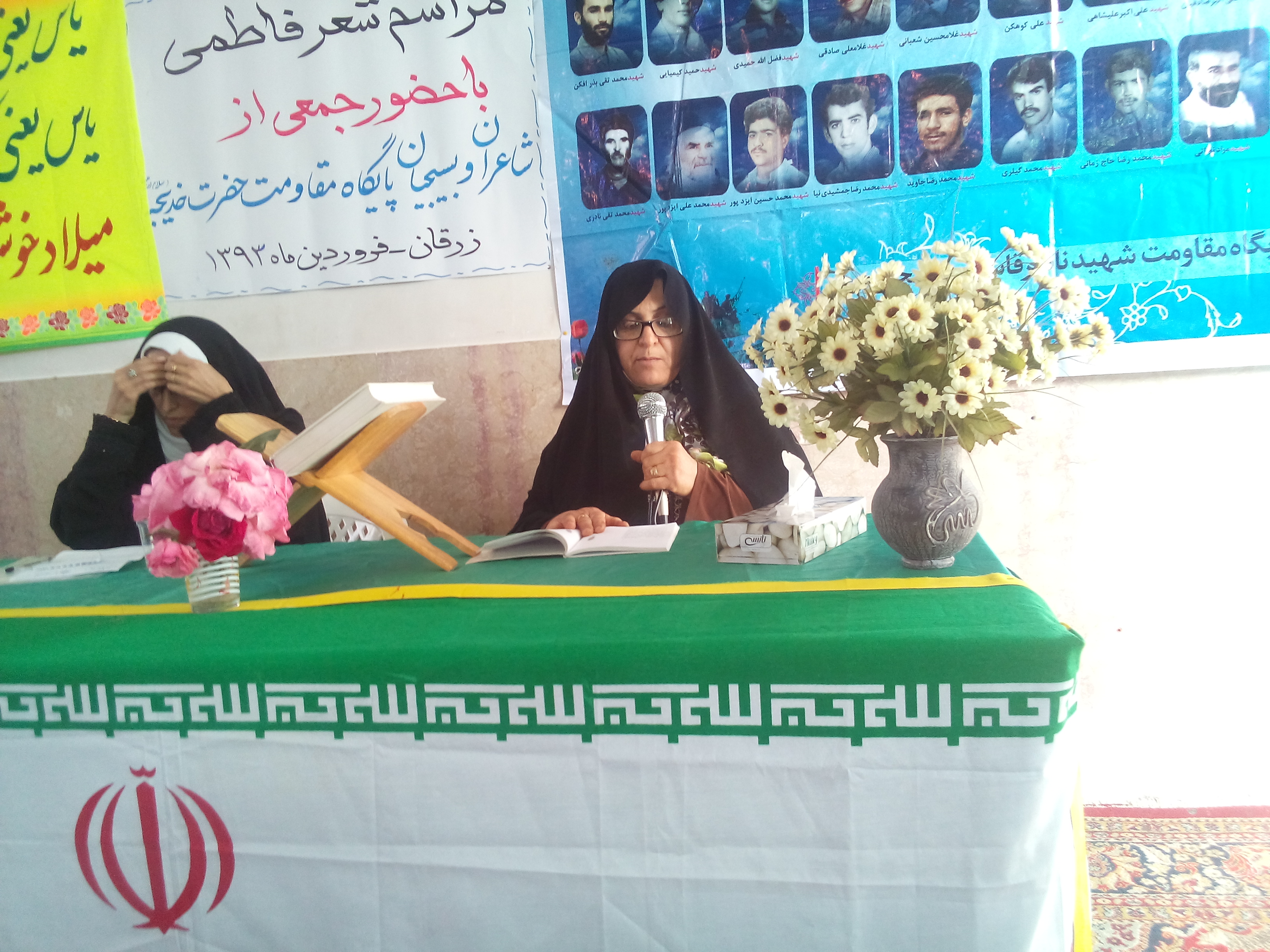 دراین مراسم که در سالروز میلاد با سعادت صدیقه کبری ، فاطمه زهرا (س)به همت پایگاه مقاومت حضرت خدیجه و انجمن ادبی مهرورزان در حسینیه حیدر زرقان بر گزار گردید شاعران زرقان ضمن گرامیداشت مقام حضرت فاطمه (س) و تجلیل روز زن و مقام مادر ، اشعار خود را به این مناسبت خواندند.