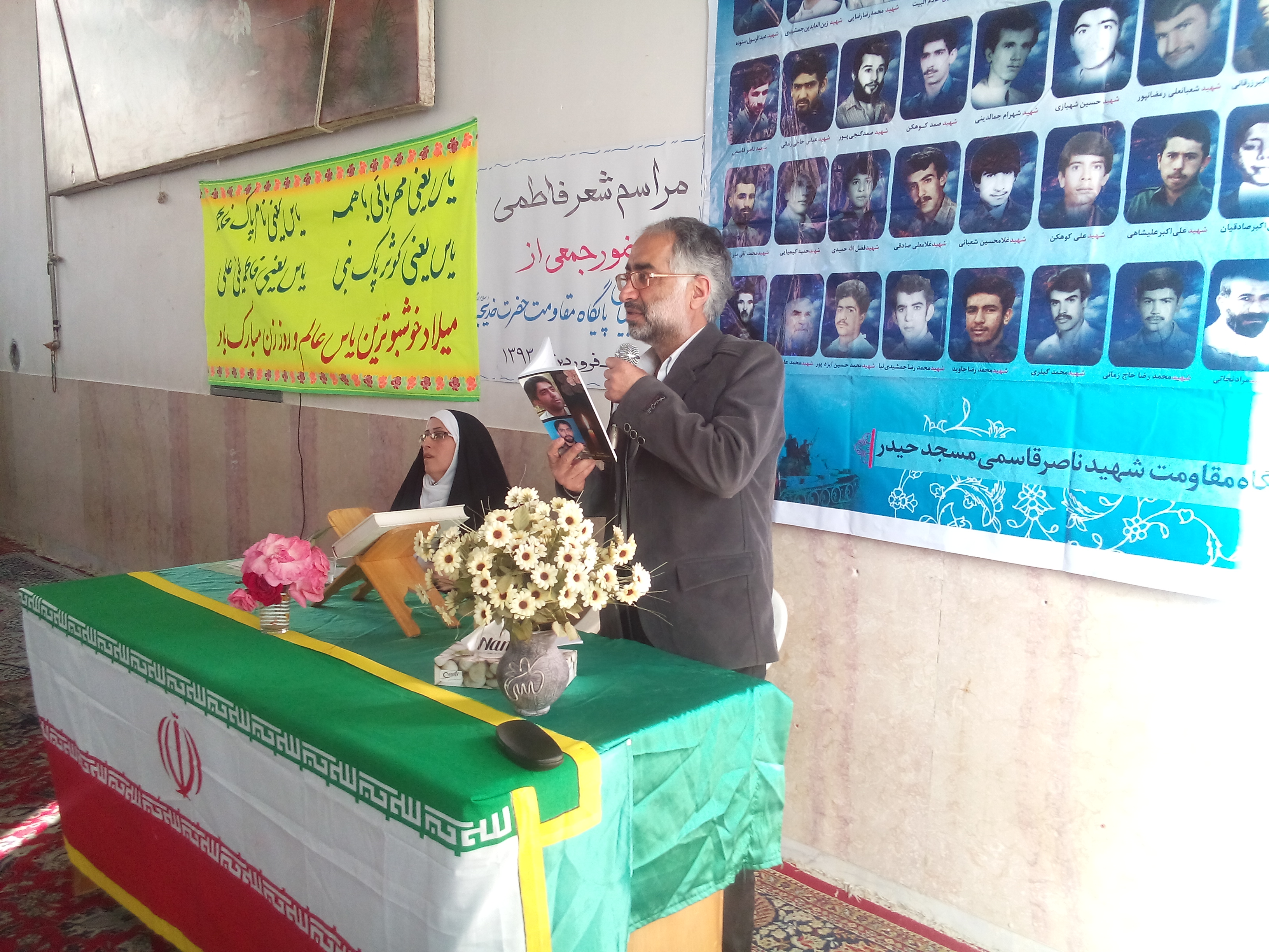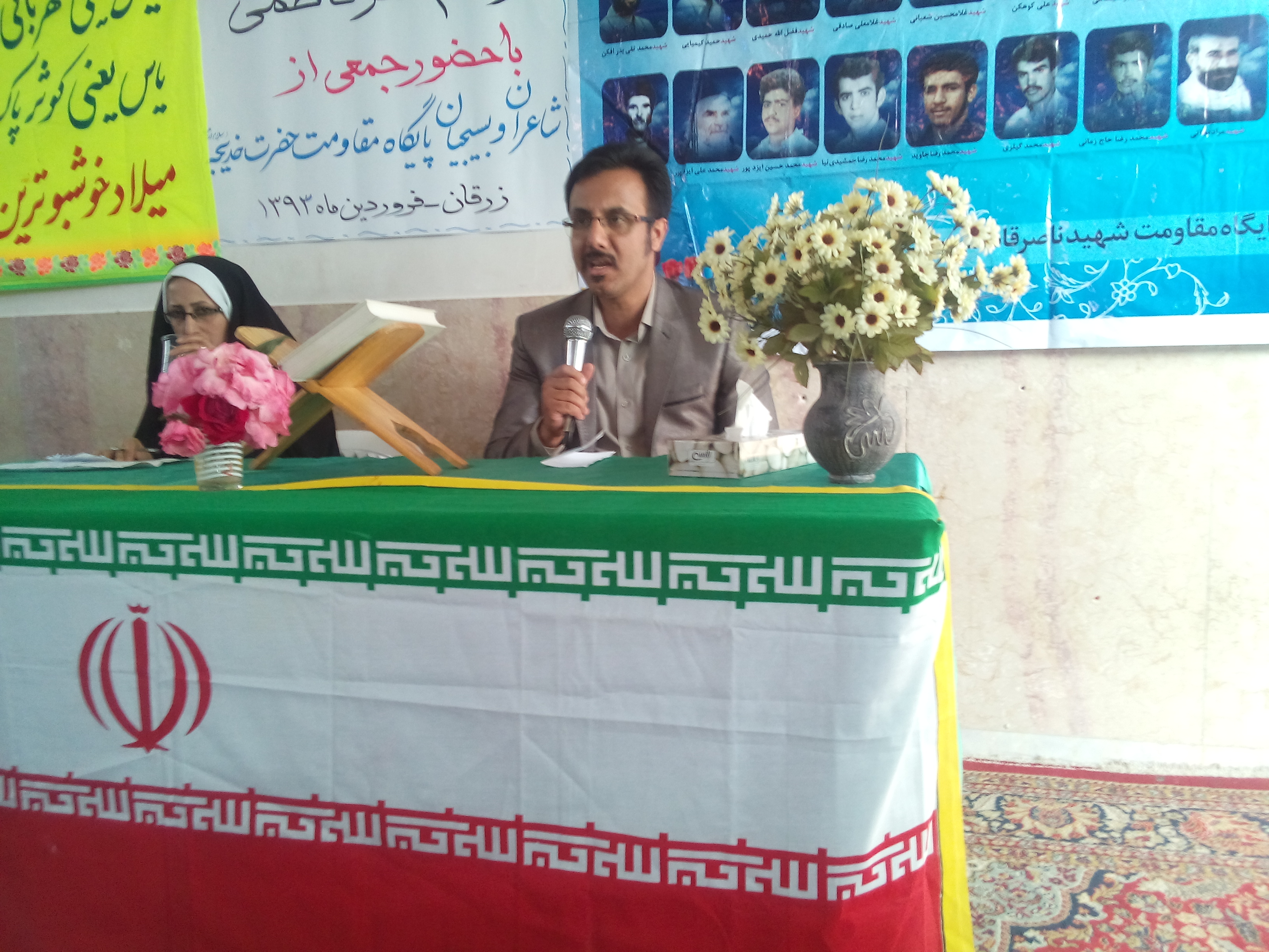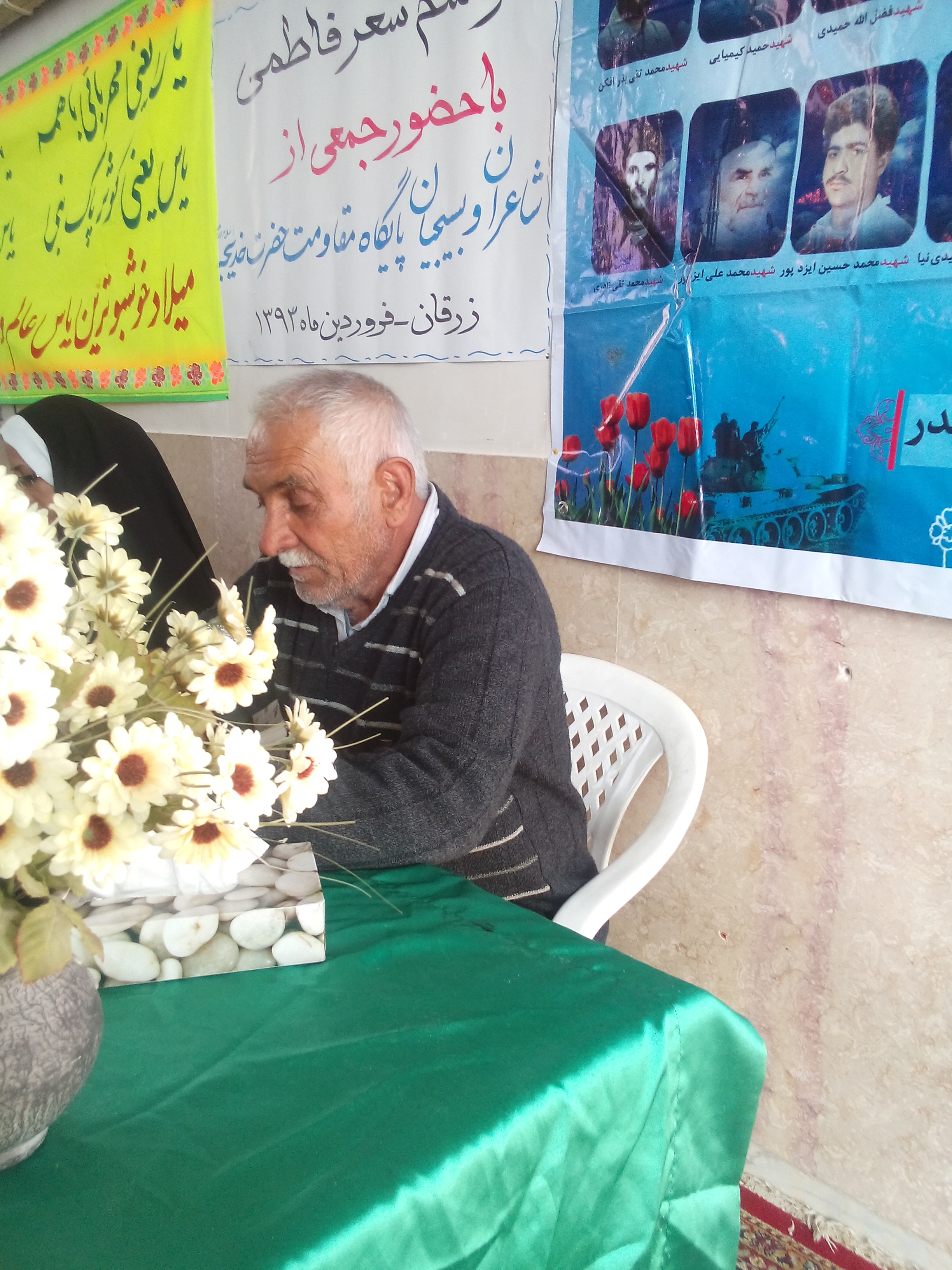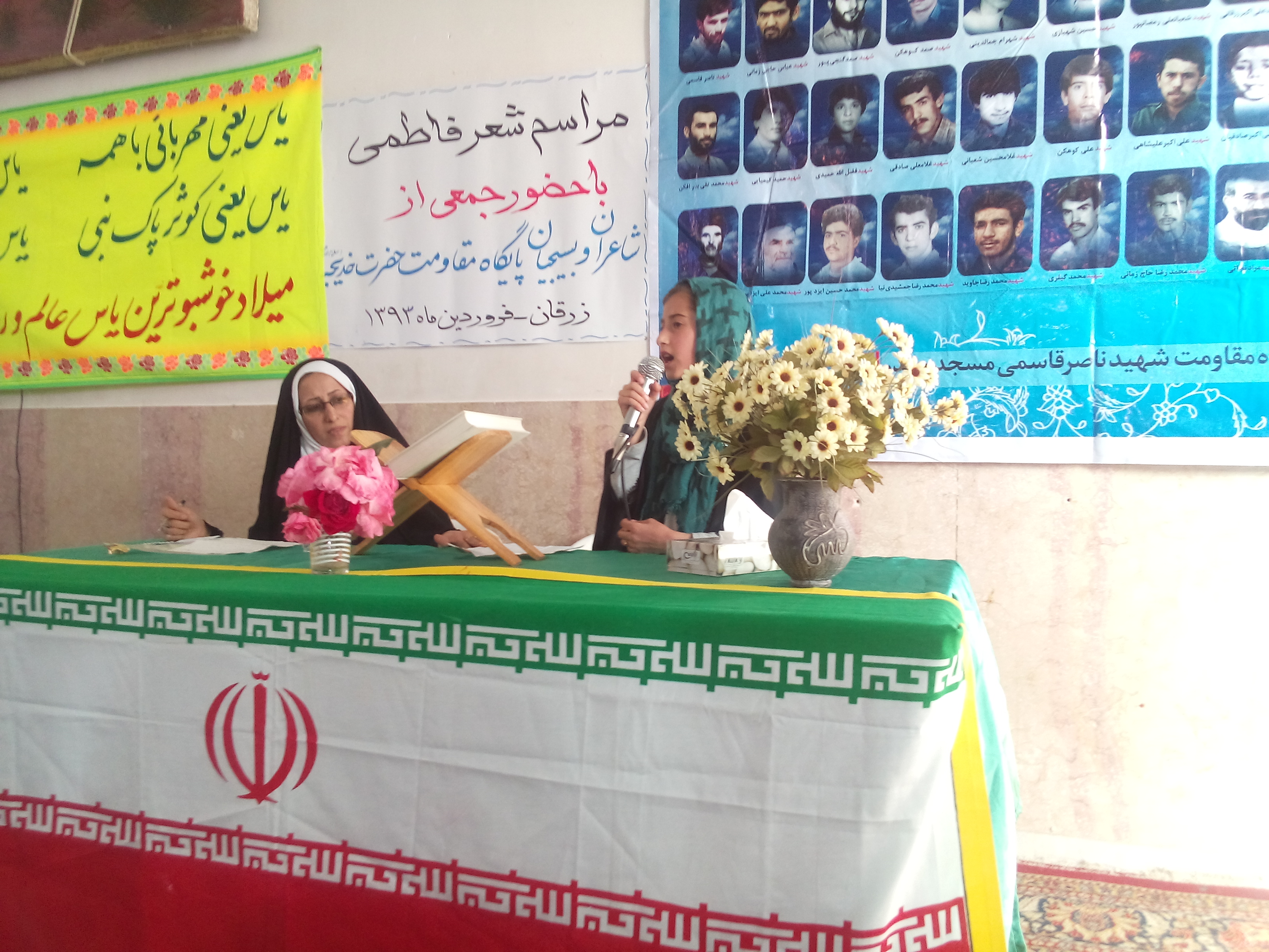 دراین مراسم که در سالروز میلاد با سعادت صدیقه کبری ، فاطمه زهرا (س)به همت پایگاه مقاومت حضرت خدیجه و انجمن ادبی مهرورزان در حسینیه حیدر زرقان بر گزار گردید شاعران زرقان ضمن گرامیداشت مقام حضرت فاطمه (س) و تجلیل روز زن و مقام مادر ، اشعار خود را به این مناسبت خواندند.