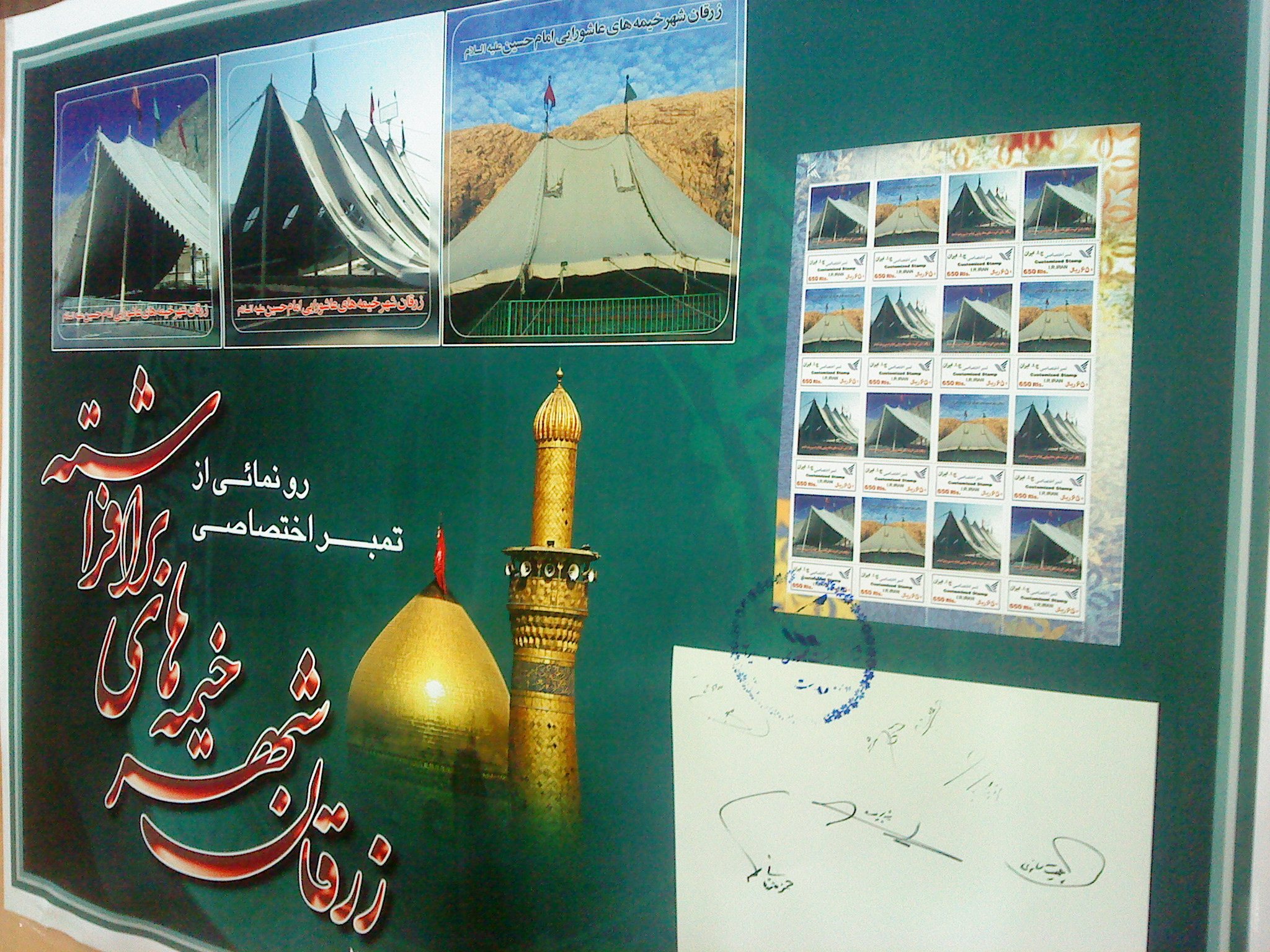 با همت خادمان و عاشقان حضرت ابا عبدالله الحسین (ع) و تلاش مسئولین شهر زرقان و استان فارس از تمبر ((زرقان شهر خیمه های بر افراشته)) رونمایی شد.